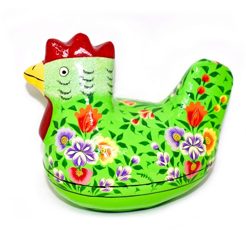 Hand painted papier-mâché chicken shaped box decorated in a mix of flower designs.