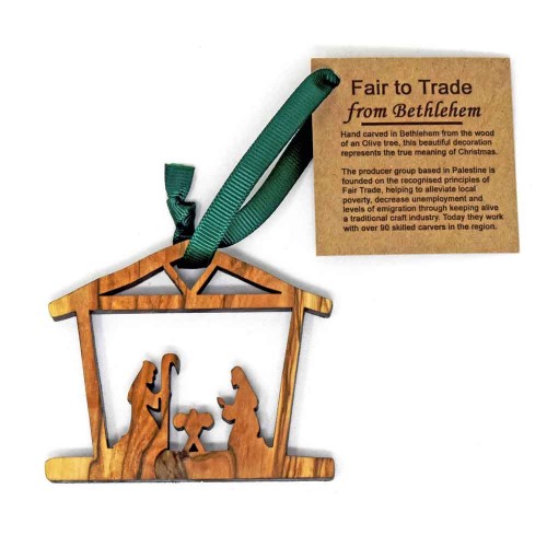 Pack of 12 hand carved olive wood hanging nativity stable decorations with a green ribbon made by a fair trade group in Bethlehem.