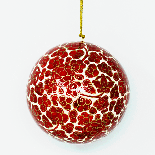 Pack of 12 hand painted papier-mâché baubles made in Kashmir featuring the traditional Sonamarg design on an assortment of red, blue and green background colours.