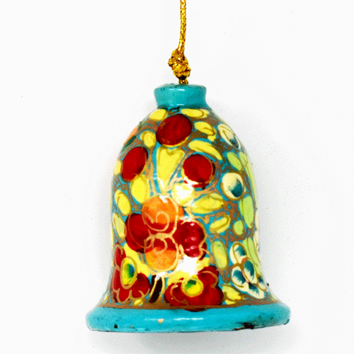 Pack of 12 hand painted wooden bells made in Kashmir featuring a green flower design.