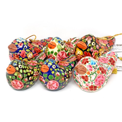 Pack of 12 hanging papier-mâché bird decorations hand painted in an assortment of patterns and colours (designs may vary).