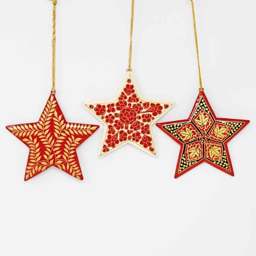Pack of 12 hand painted red wooden stars made in Kashmir featuring three our most popular Kashmiri designs.