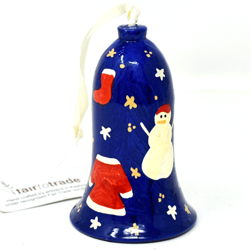 Pack of 12 hand painted wooden bells made in Kashmir with a colour wrap red or blue design.