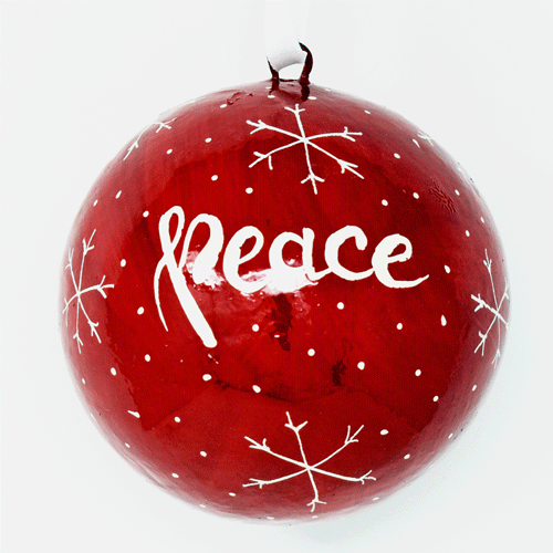 Pack of 12 hand made papier-mâché baubles made in Kashmir featuring various messages on a red background.