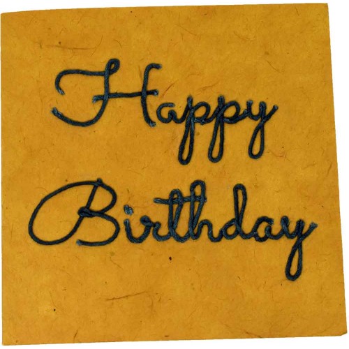 Pack of 6 hand made paper cards made in Nepal with "Happy Birthday" spelt out of string on a yellow background.