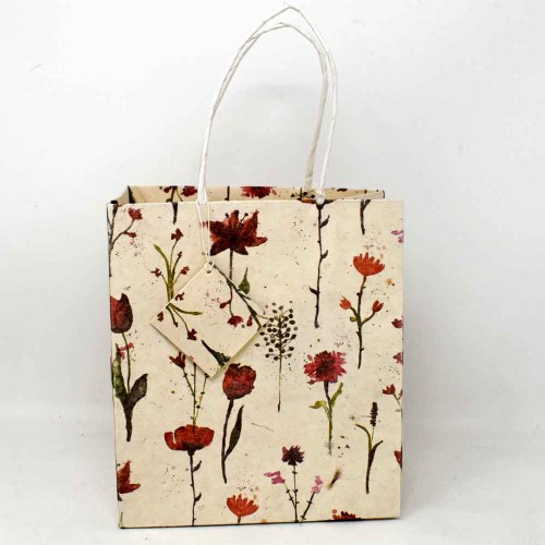 handmade Lokta paper medium sized bags which which are silk screened with a red flowers design. Sold in pack size of 6.