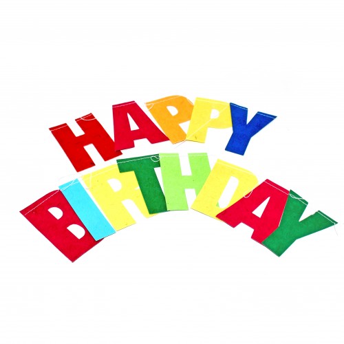 handmade paper garland with happy birthday in multi coloured letters. Sold in pack size of 6.
