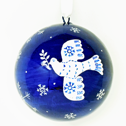 Pack of 12 hand painted papier-mâché baubles featuring a Christmas dove design with snowflakes on a blue background. Made in Kashmir.